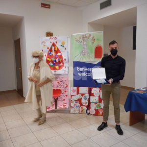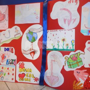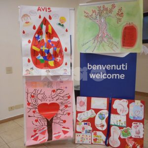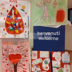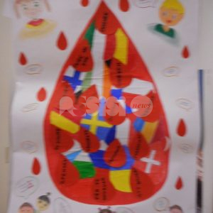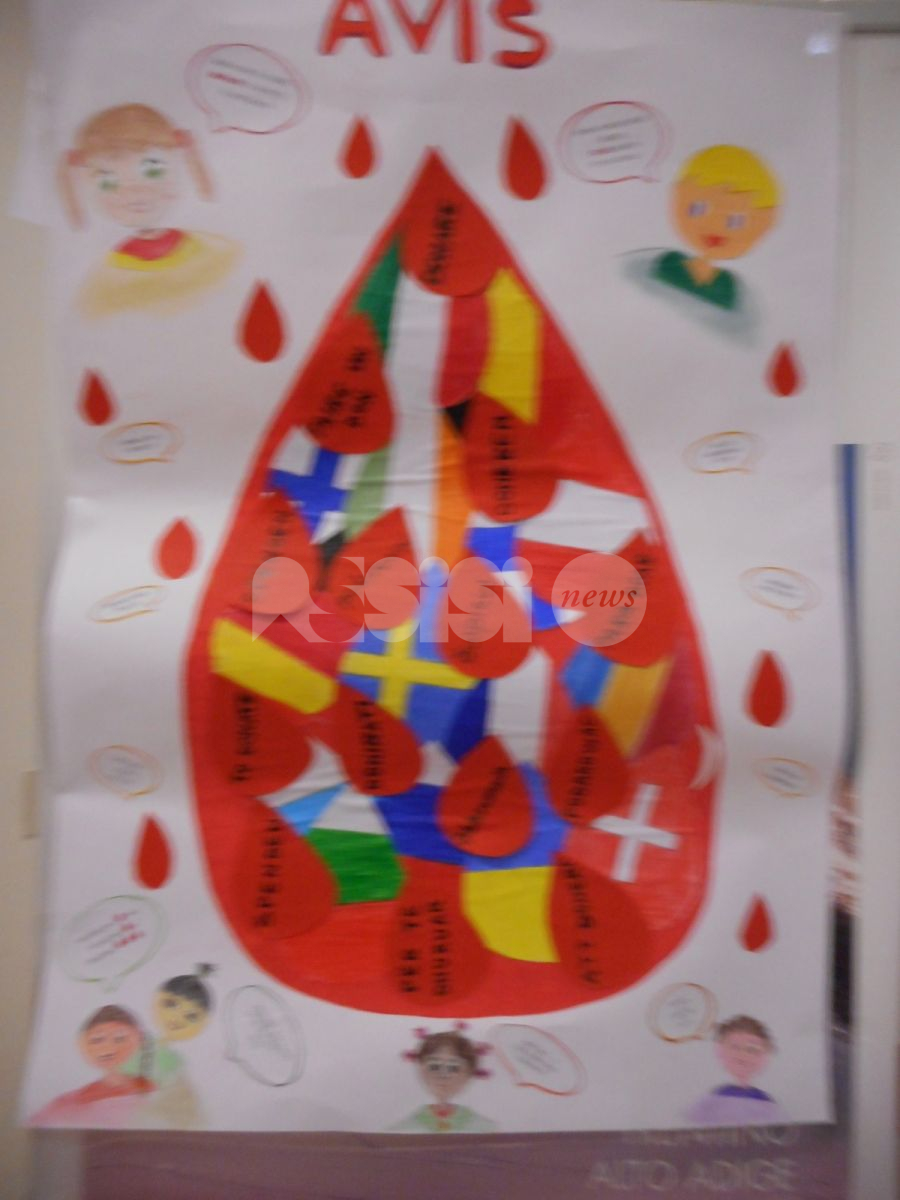 Il lavoro della classe ha evidenziato il carattere universale della donazione che passa attraverso tutti i Paesi e tutte le lingue, come si nota leggendo le scritte all’interno dell’enorme goccia di sangue.