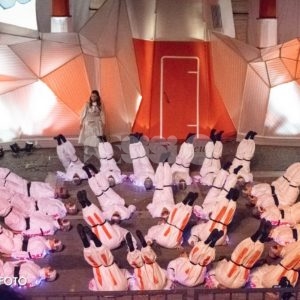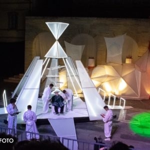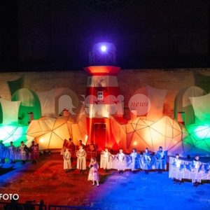 Dopo la cerimonia d’inaugurazione e la benedizione degli stendardi e dei mantelli, dopo la sfilata del Rione San Rocco, intitolata Soltanto Uno (trama e foto) e dopo la sfilata del Rione Sant’Angelo, intitolata Somnii Memoro (trama e foto), ieri sera è stata la volta della sfilata del Rione Moncioveta al Palio de San Michele 2019, dal titolo “Thestral M15”.