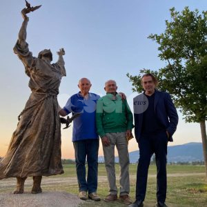 “Noi crediamo nell’unità – ha aggiunto il sindaco Proietti – di un territorio che si ritrova negli stessi valori. Un protocollo lega le terre francescane di Assisi e Cannara, siamo un’unica comunità nelle sfide per i fragili e per la riscoperta di una pagina francescana straordinaria, per noi è motivo di grande gioia”. Il progetto del santuario a cielo aperto prevede anche una seconda fase con la realizzazione di un altare marmoreo, affidata sempre allo stesso artista. “Quando ho fatto il sopralluogo, prima di vincere il concorso e mettermi all’opera – ha spiegato Antonio De Paoli –, mi hanno ispirato la natura e il silenzio del posto. Ho dato l’anima per questo lavoro, certi uomini hanno la prerogativa di essere eterni, restano scolpiti per sempre, Francesco rappresenta la figura più vicina a Cristo. Ho scelto di rappresentare il santo immerso in un volo d’uccello, non è una statua ma la scultura dell’azione che diventa significato stesso di quello che lui vuole esprimere, il contatto tra la terra e il cielo, l’abbraccio al Creato”. Promotore e motore di questa iniziativa il Comitato Piandarca che ha voluto da sempre preservare questo sito, anche partecipando all’iniziativa del Fai ‘I luoghi del cuore’. “L’impegno con il Fai ci ha dato un grosso aiuto, era il 2014, e ci ha permesso di elaborare il progetto ‘Dal Bosco di san Francesco in Assisi a Piandarca e il sentiero della predica agli uccelli’ che inaugureremo il prossimo ottobre. Il passo più importante è stato quando la parrocchia è riuscita ad acquisire un’area nei pressi del luogo della predica e siamo partiti con il progetto di un santuario all’aperto. Siamo arrivati a questo primo obiettivo con una statua che dà un’interpretazione tutt’altro che convenzionale della figura di san Francesco. Adesso inizia il secondo momento, raccogliere fondi per l’altare in pietra scolpita che riproporrà motivi legati alla predica”.