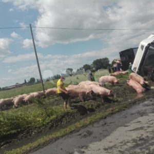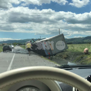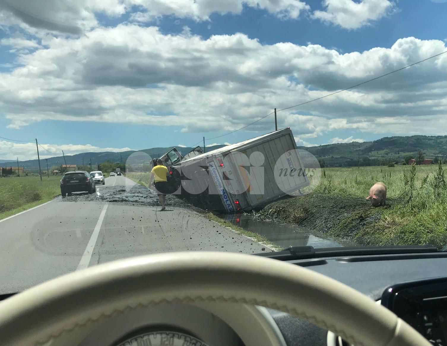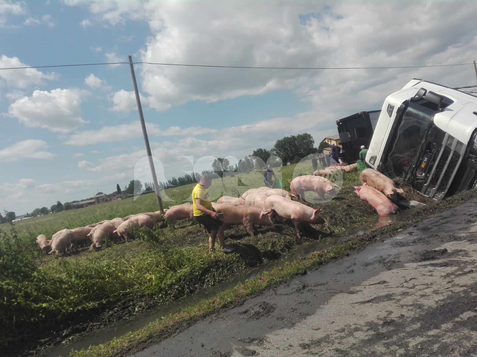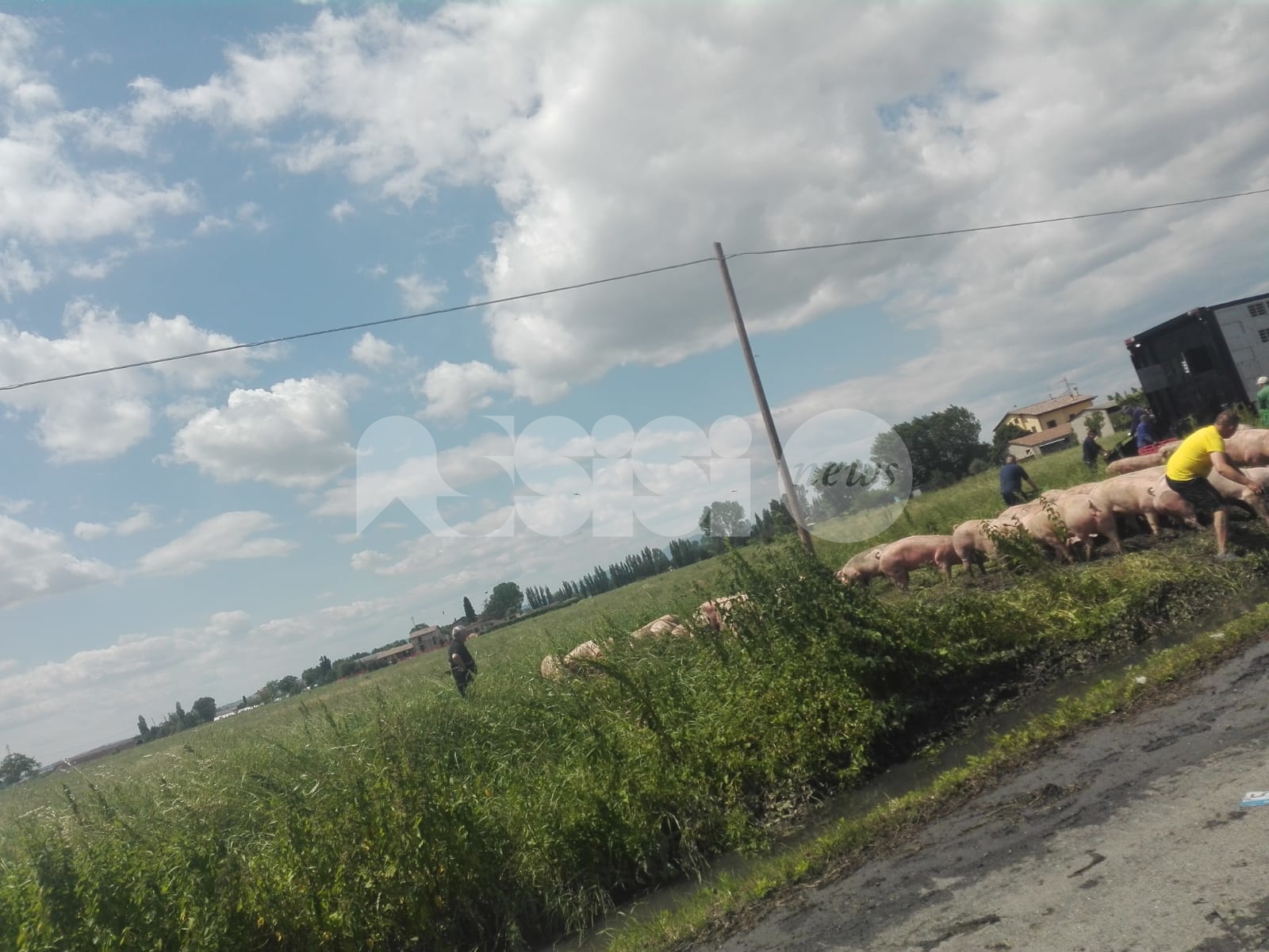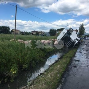 Il sinistro sarebbe avvenuto quando il mezzo si è avvicinato sulla cunetta che poi ha ceduto. Durante l’incidente, fra l’altro, il portellone posteriore si è aperto con gli animali fuggiti nelle campagne circostanti. Pesanti i disagi al traffico. Non si escludeva uno slittamento dell’orario nel passaggio del giro d’Italia amatori che era previsto proprio per la giornata di venerdì. Il percorso è stato poi spostato tout court.