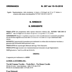 Presenti in città i protagonisti della serie tv, a cominciare da Elena Sofia Ricci, che interpreta la protagonista, suor Angela e Valeria Fabrizi (nel ruolo di suor Costanza), Francesca Chillemi, Cristiano Caccamo, Arianna Montefiori, Gianmarco Saurino e Christian Monaldi. Oltre agli attori, decine di persone tra troupe e tecnici. Per facilitare le riprese e i movimenti degli addetti ai lavori e dei loro mezzi, si renderanno necessarie alcune modifiche alla normale circolazione stradale che sono riportate nell’ordinanza n. 287 del 19-10-2018 (nella gallery in fondo). Tali modifiche saranno limitate alle esigenze di ripresa di Che Dio ci aiuti 5, e non limiteranno in alcun modo i servizi essenziali quali, per esempio, gli scuolabus e i servizi di trasporto di ogni genere: il trasporto pubblico, ove necessario, verrà effettuato su linee alternative per garantire ai cittadini un servizio comunque soddisfacente.
