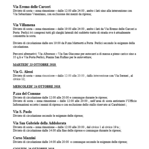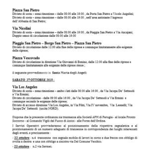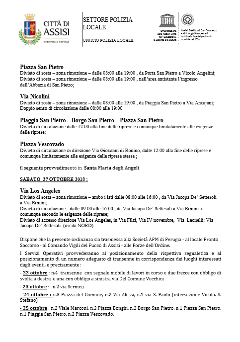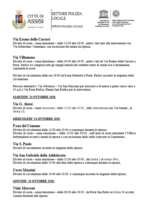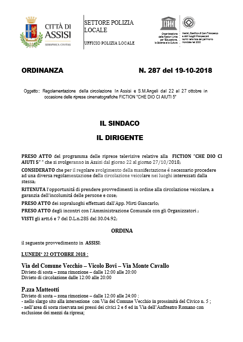 La riprese di Che Dio ci aiuti 5 interesseranno, lunedì 22 ottobre: via del Comune Vecchio, vicolo Bovi, Via Montecavallo (dalle 12 alle 20), piazza Matteotti, via Eremo delle Carceri (12-24), via Villamena (19-24); martedì 23: Via Alessi (12 – 20); mercoledì 24: piazza del Comune (12-24; via San Paolo; via San Gabriele dell’Addolorata (12 – 20), corso Mazzini (14-20); giovedì 25: viale Marconi (8-19); piazza San Pietro, via Nicolini (8-19), piaggia San Pietro, Borgo San Pietro, piazza San Pietro (dalle 12); piazza Vescovado (dalle 12). Sabato 27 le riprese a Santa Maria degli Angeli: in via Los Angeles (8-16). Nelle giornate limitazioni previste anche nelle strade limitrofe.