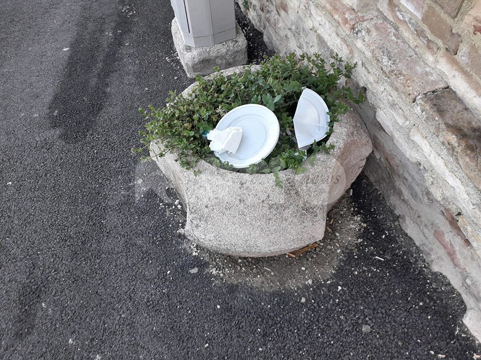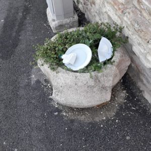 I problemi, soprattutto legati al guano dei piccioni, sono stati piĂą volte segnalati agli organi competenti e all’amministrazione comunale. Nel vicolo, oltre all’emergenza incuria, presente anche un grande pezzo di plastica (sembrerebbe di un’automobile) abbandonato da circa 10 giorni ed appoggiato in un angolo. Urgente la pulizia dei vicoli ed interventi che possano interrompere tali accadimenti. Altro caso, nella zona di Porta San Francesco, dove sono spuntati dei piatti dentro ai vasi dei fiori.