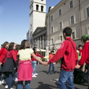 Le armonie della felicità – voci, risonanze e accordi dell’inclusione interculturale ha visto protagoniste gli alunni di dodici classi quarte di sei diversi plessi scolastici (in totale, circa 2000 alunni che hanno formato un anello che da Piazza San Francesco si è snodato lungo le principali vie del centro storico) e richiamandosi allo Spirito di Assisi e più in generale ai principi universali di accoglienza e pace legati alla figura di San Francesco, ha inteso promuovere e sviluppare l’inclusione interculturale affinché i giovani Cittadini, accompagnati da Insegnanti, Famiglie, Istituzioni e dall’intera Comunità di appartenenza, diventassero Protagonisti e Costruttori di Pace. L’Inno “Girotondo” del progetto Le Armonie della Felicità è stato composto appositamente dal M° Maurizio Mastrini – che ha seguito anche la supervisione artistica del progetto – ma ha visto anche la collaborazione di “500 mani” nella stesura definitiva del testo. Il brano, oltre a rappresentare il “cuore” dell’intero progetto, ha costituito anche la sigla del “Festival Internazionale della Felicità Città di Assisi”.