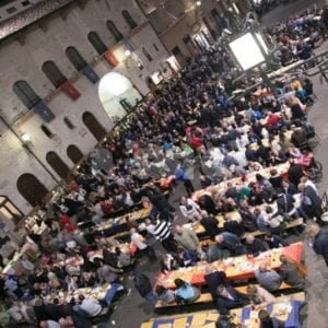 Piazza del Comune piena di gente – nonostante il freddo – per la cena aperta per le autorità del Piemonte, con tozzetti e vin santo che hanno chiuso le degustazioni enogastronomiche regionali a cura dell’Istituto Alberghiero di Assisi. Applausi per l’esibizione di sbandieratori, dei tamburini, del gruppo danza e del gruppo fuoco della Compagnia Balestrieri Assisi, il gruppo di cornamuse “Saint Francis Pipe Band in Glasgow” fondato dai Padri Francescani nel 1926 e musica e canti della tradizione popolare umbra a cura di ResonArs.