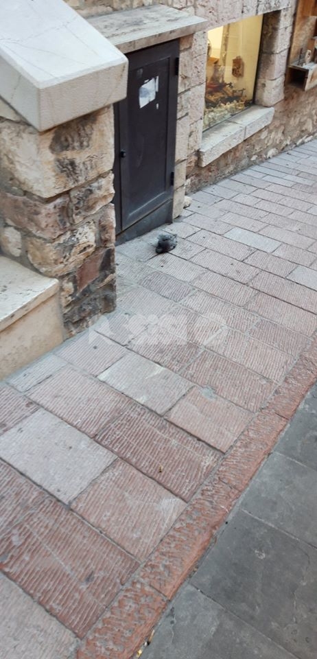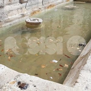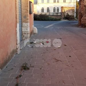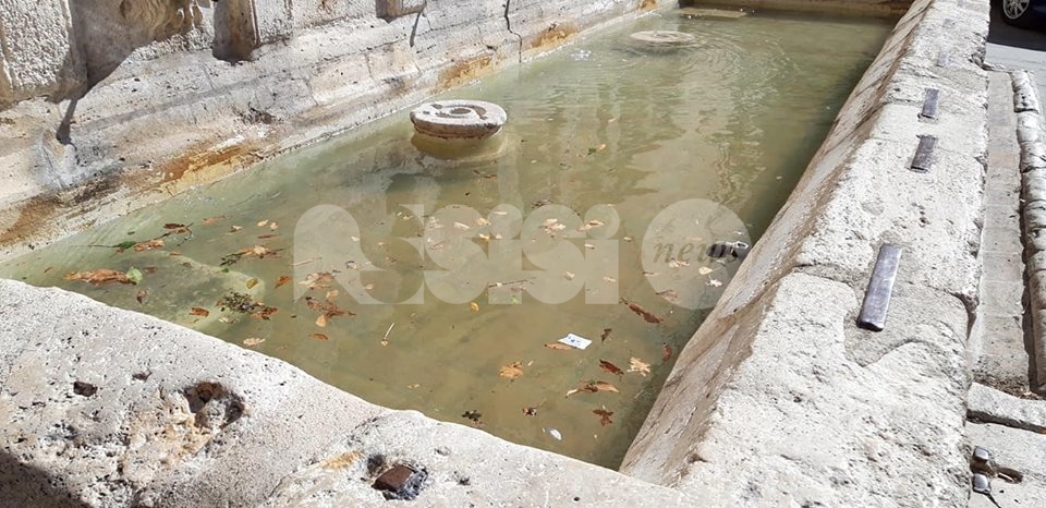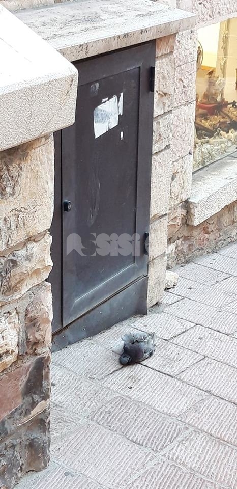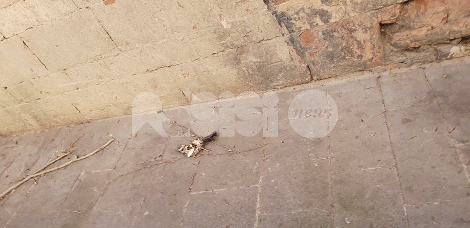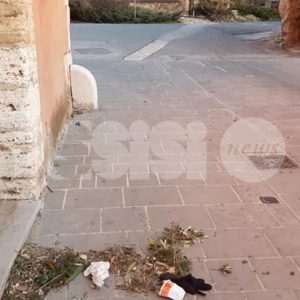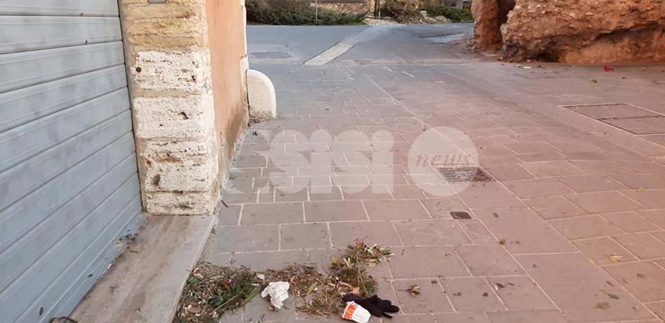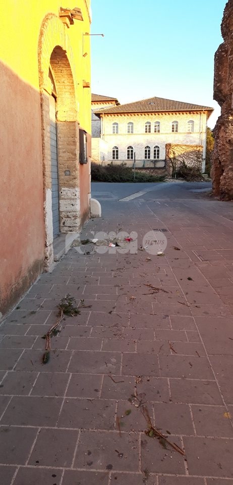 Ma i rifiuti sembrano abbandonare ovunque, nei vicoli del centro storico ma anche in zone centralissime, tipo via Fortini e alla Piaggia di San Pietro – qui, almeno, sono stati tolti dopo poche ore – ci sono piccioni morti, tracce di deiezioni degli stessi volatili (nessuno le spazza e le pulisce, l’idropulitrice pulisce solo il centro della strada) e foglie secche, oltre a cartacce, lattine e brick di bevande. E ancora: la fontana di San Rufino è piena di foglie, mentre a Santa Maria degli Angeli il