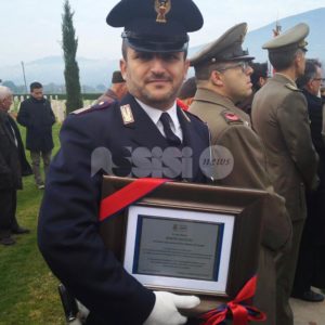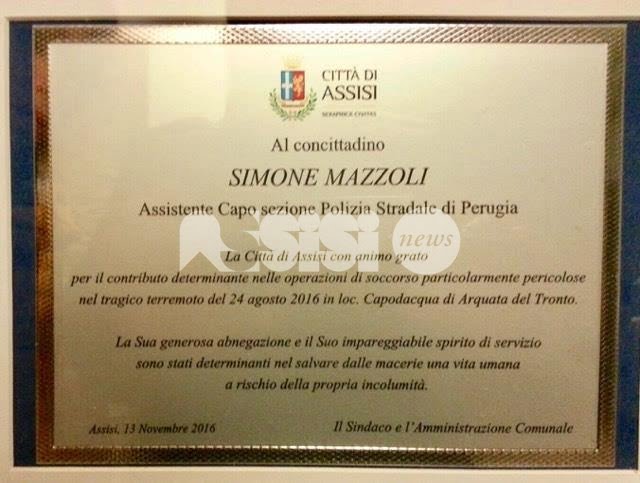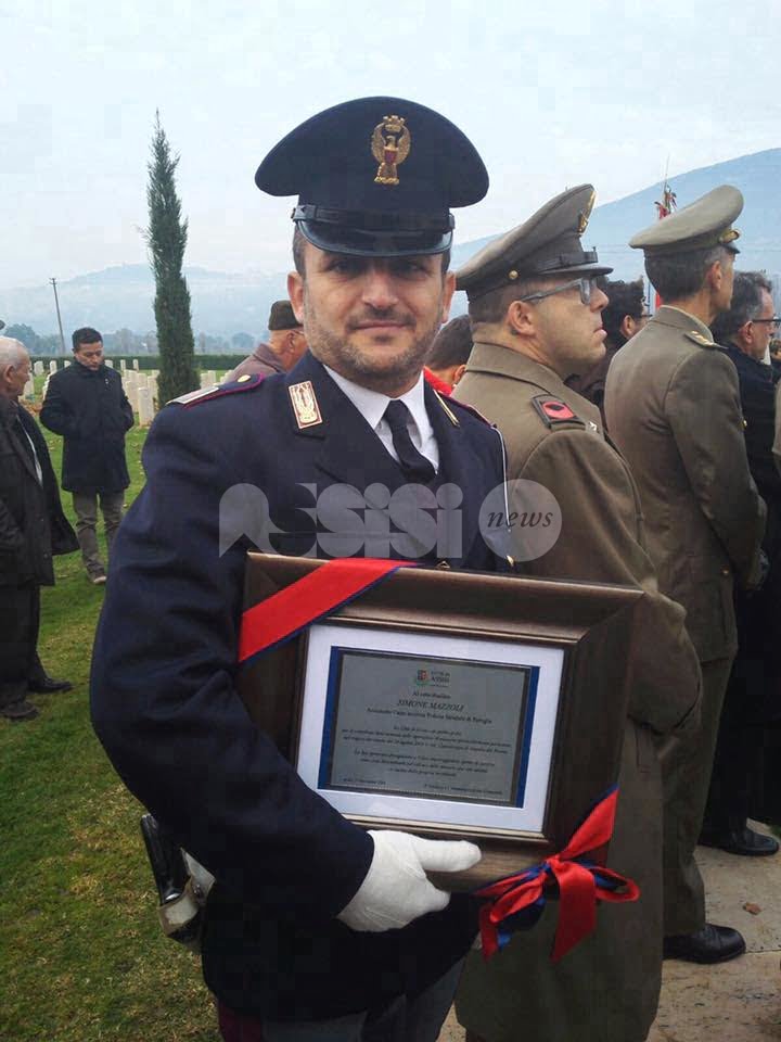 Simone Mazzoli ha ricevuto domenica una targa al merito, perché salvare una vita umana non capita tutti i giorni. La cerimonia si è svolta a Rivotorto di Assisi, casa dell’agente, in occasione della commemorazione dei caduti di tutte le guerre e il prestigioso riconoscimento è stato consegnato dal sindaco di Assisi Stefania Proietti e dai consiglieri comunali Luigi Bastianini e Giuseppe Cardinali, alla presenza del comandante militare dell’Esercito regione Umbria Michele Fasciano.