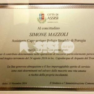 “Non mi sento affatto un eroe – ha dichiarato Simone Mazzoli, ricordando anche il collega Andrea Vecchini, che non era presente (il premio è stato assegnato dall’Amministrazione cittadina a Mazzoli come cittadino di Assisi, onorata per il prezioso gesto dell’assistente capo della Polizia Stradale) – ho fatto semplicemente il mio dovere in uno scenario drammatico. Grazie a chi ha voluto questa giornata, grazie per questo prestigioso riconoscimento”. Non era presente la superstite: “Ho provato a contattarla personalmente, ancora non sta molto bene, a Capodacqua di Arquata del Tronto e non solo li, ci sono ancora brutti ricordi”.