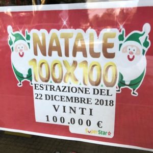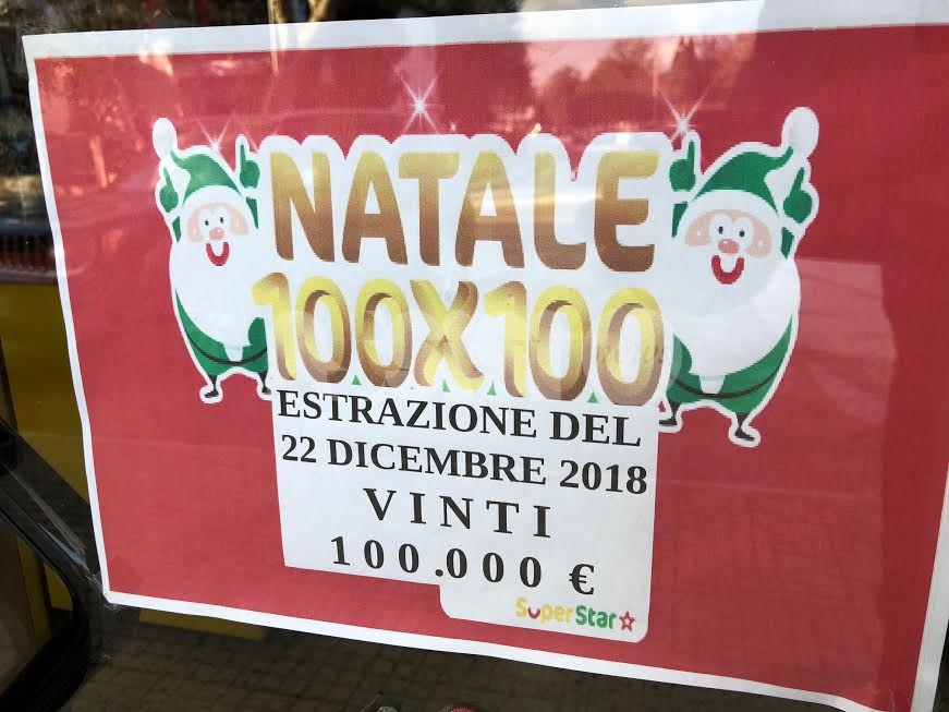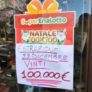Nell’estrazione vincente del 22 dicembre 2018, che ha unito Superenalotto – Superstar, con 100 premi da 100 mila euro in tutta Italia, oltre al biglietto vincente di Assisi (Santa Maria degli Angeli) c’erano stati altri biglietti anche in Umbria. I premi da 100 mila euro che hanno visto appunto vincenti tre biglietti 100×100 Natale sono stati acquistati a Città di Castello, ad Assisi e a Torgiano. Queste le matrici: a Città di Castello 5767BC990021-2; a Torgiano 3430AC99000C-2; ad Assisi (Santa Maria degli Angeli) 4903AC99006B-2.