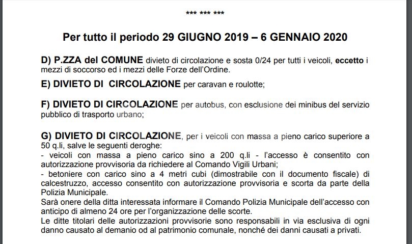 “Se poi alcune di queste auto non sono di residenti, in alcune zone e nei giorni non consentiti, come fanno ad arrivarci?”, l’altro interrogativo. Solite contraddizioni cittadine, nei giorni in cui tanti sono in disaccordo, tanti altri in accordo, con le nuove chiusure a traffico e ad auto. A far discutere è soprattutto la chiusura, fino al 6 gennaio 2020 e senza deroghe, di Piazza del Comune, come da ordinanza reperibile sul sito ufficiale (scarica qui il pdf; continua dopo la foto). Apparentemente giunta e associazioni di categoria starebbero ‘trattando’ per degli “allegerimenti”, ma è ancora tutto in alto mare.