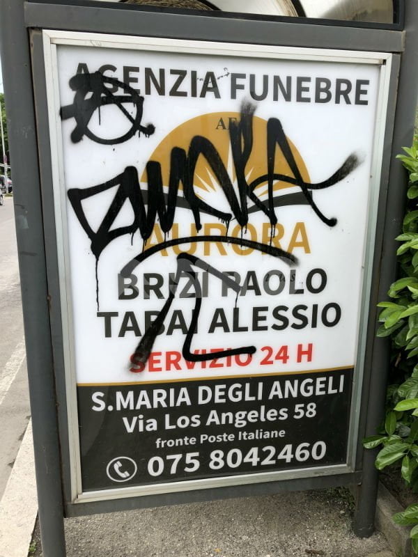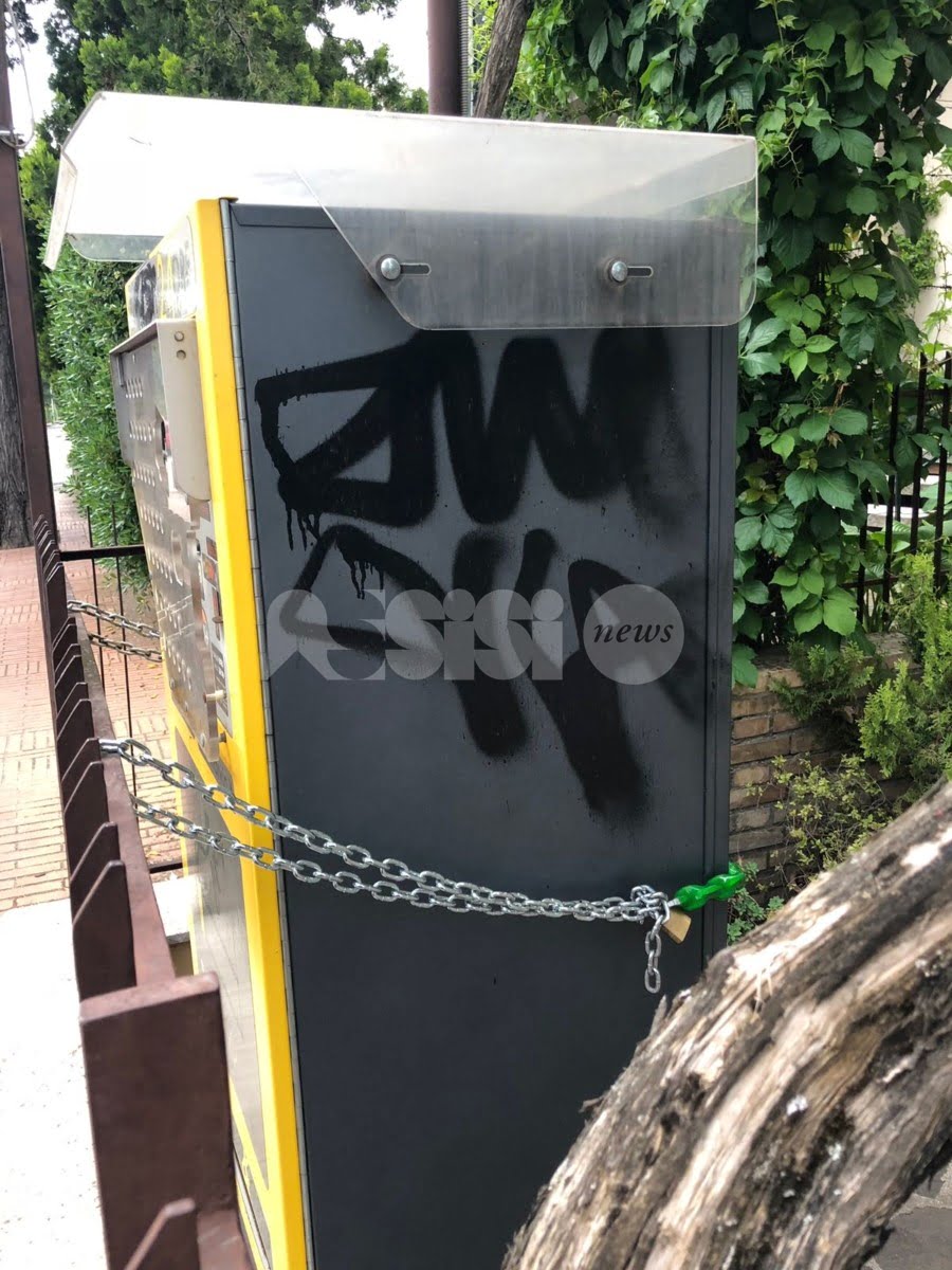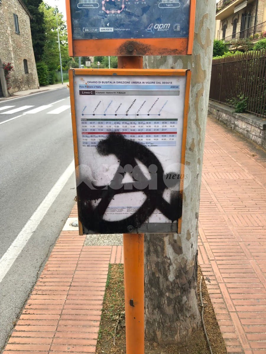 Vandali in azione ad Assisi e Santa Maria degli Angeli: nei giorni scorsi – come dimostrano le foto inviateci dai lettori – sono stati sporcati uno spazio pubblicitario in piazza Matteotti di Assisi e nelle immediate vicinanze.
