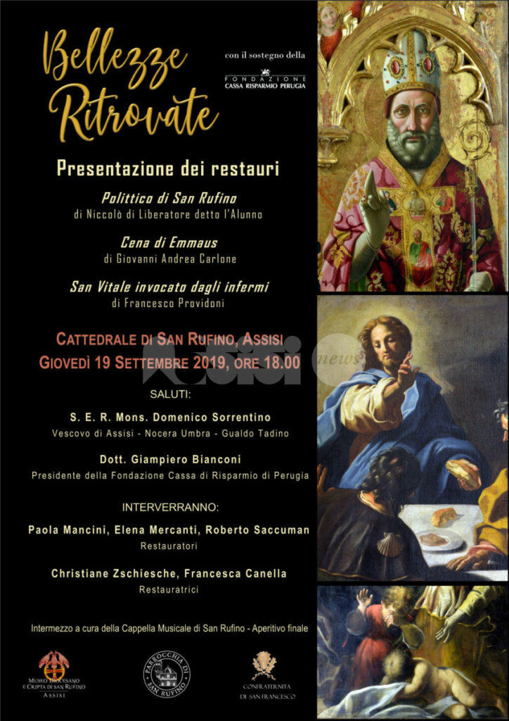 Bellezze ritrovate è il titolo dell’iniziativa nel corso della quale la Parrocchia di San Rufino, il Museo Diocesano e la Confraternita di San Francesco presenteranno la conclusione dei restauri di tre importanti opere.