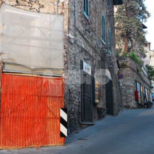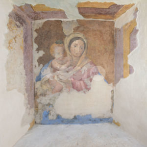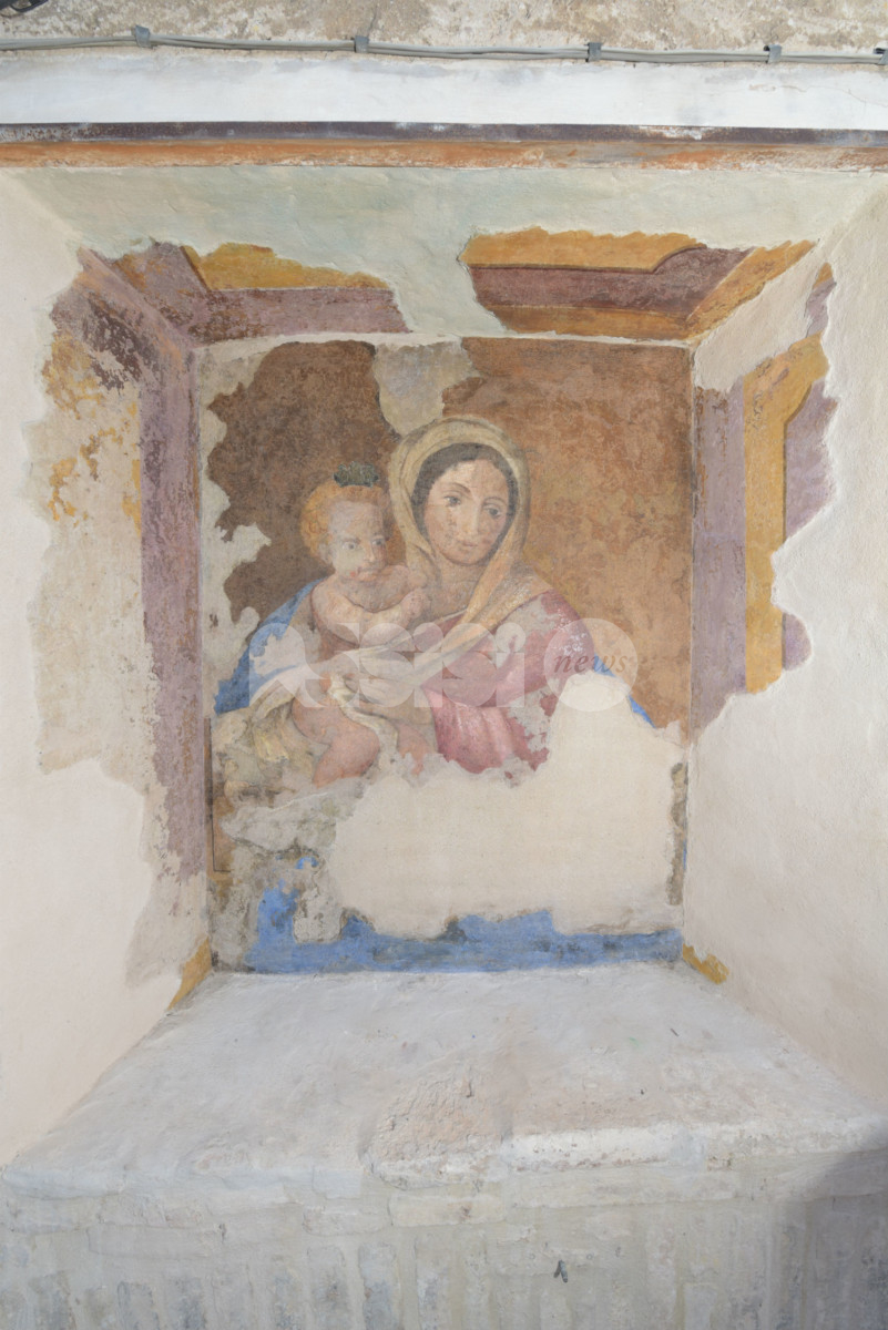 “All’incrocio con Vicolo Frondini – spiega infatti la Elisei a proposito dell’edicola votiva di via Frondini – passava in antico la cinta romana. E’ probabile che alla fine del XIII secolo vi fosse una portella, per servire la nuova via che conduceva a San Francesco, in parallelo con via Superba. Di questa presunta portella rimane la mensola di imposta murata sullo spigolo di Palazzo Fiumi- Roncalli’ Così recita la Guida di Assisi storia e arte redatta da P.M. Della Porta, E. Genovesi, E. Lunghi, del 1991, a pag 96. La pianta allegata in fondo al volume IV di NOVA VITA DI SAN FRANCESCO di Arnaldo Fortini, del 1959, conferma l’esistenza della cinta muraria proprio in quel posto. Ed è facile immaginare la ‘portella’ con l’arco che parte dal capitello posizionato al lato del palazzo Fiumi Roncalli, fino ad arrivare alla nicchia affrescata. Questo conferma il fatto che la parete che ospita la nicchia ha avuto nel tempo grandi trasformazioni, e che la nicchia era molto più profonda rispetto ad ora. Trasformazioni sicuramente avvenute nel corso del passaggio dalla fase dove era in essere la ‘portella’ e quella successiva. Inoltre la Madonna ha lo sguardo rivolto a sinistra, ed è verosimile dedurre che guardasse la gente che usciva dalla ‘portella’, come a benedirne il passaggio”.