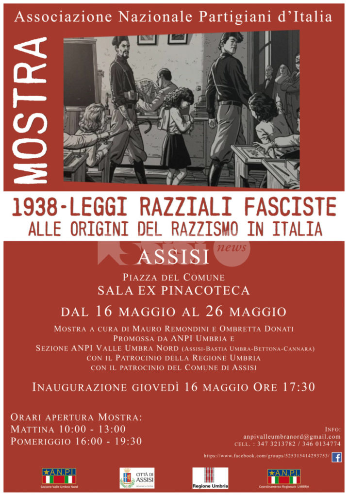 La Sezione territoriale A.N.P.I. Valle Umbra Nord organizza una Mostra dedicata a: “1938 – Leggi razziali fasciste – Alle origini del razzismo in Italia”. L’esposizione viene organizzata in concomitanza con l’ottantesimo anniversario della promulgazione delle famigerate leggi, in collaborazione con l’A.N.P.I. Provinciale e Regionale, realizzata dal Museo Diffuso della Resistenza di Torino, con la Fondazione Villa Emma, e con l’autore della mostra prof. Mauro Remondini.