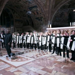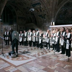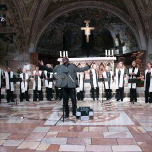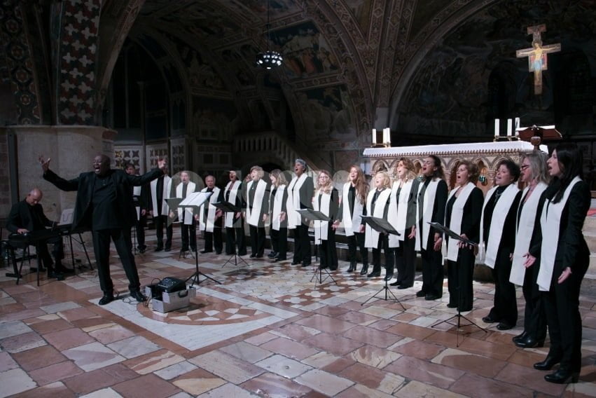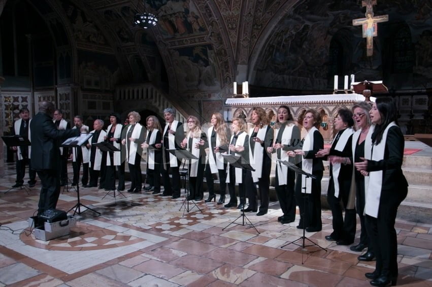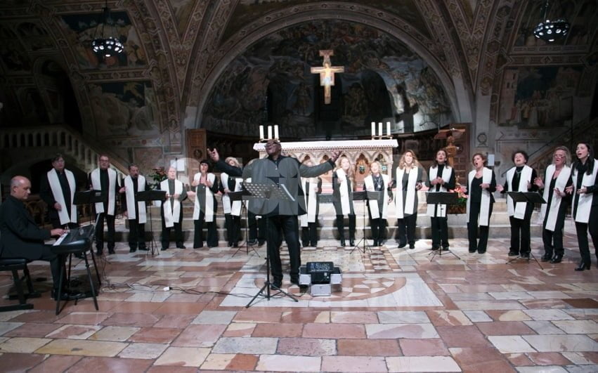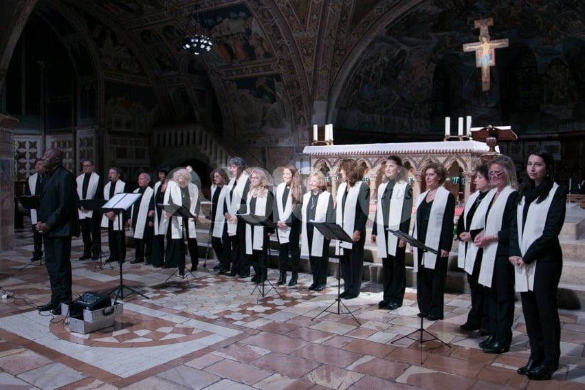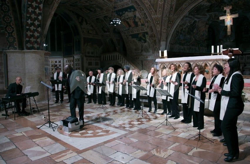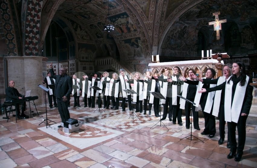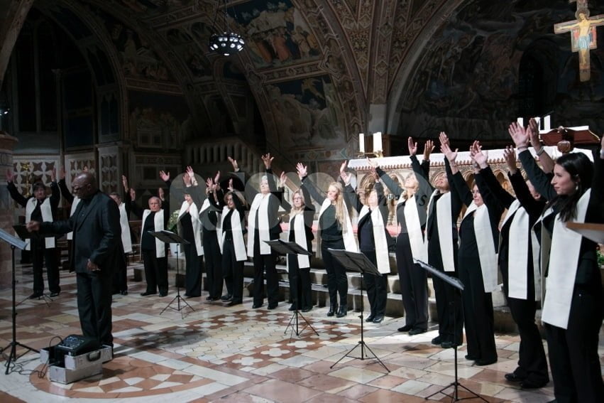 Dopo l’appuntamento di apertura, il primo concerto di Assisi Pax Mundi ha visto come protagonisti i Charlie’s Gospel Angels, esibitisi nella Basilica Inferiore di San Francesco: il coro Gospel dà un’interpretazione tutta nuova della musica sacra francescana offrendo nuove note di dialogo, incontro e ascolto.