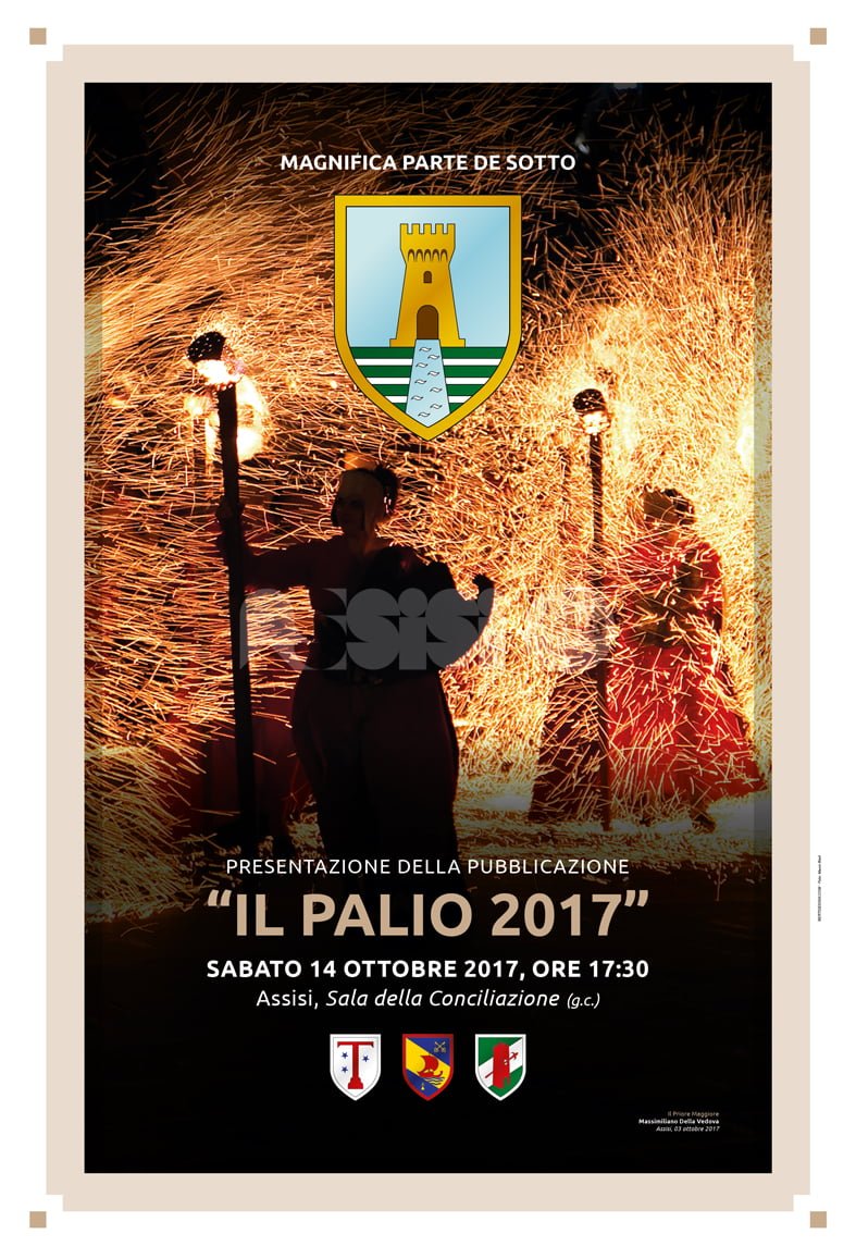 Il Palio 2017, in uscita quest’anno con largo anticipo rispetto al passato e a pochi giorni della festività di San Francesco Patrono d’Italia, racconta con foto e testi l’ultima edizione dei “rossi”; autofinanziato dalla Parte de Sotto, è il settimo di una ormai lunga serie iniziata nel 2008, è composto da 80 pagine ed è arricchito di contenuti inediti, così da risultare ogni anno un oggetto unico. Le foto sono di Mauro Berti e Renato Elisei, il coordinamento editoriale di Giuseppe Di Biagio, il progetto grafico e l’impaginazione dello Studio Berti Design, che ha realizzato graficamente tutte le edizioni dello stampato, finito appunto di stampare dalla Tipolito Properzio di Santa Maria degli Angeli all’inizio del mese di ottobre 2017.