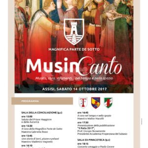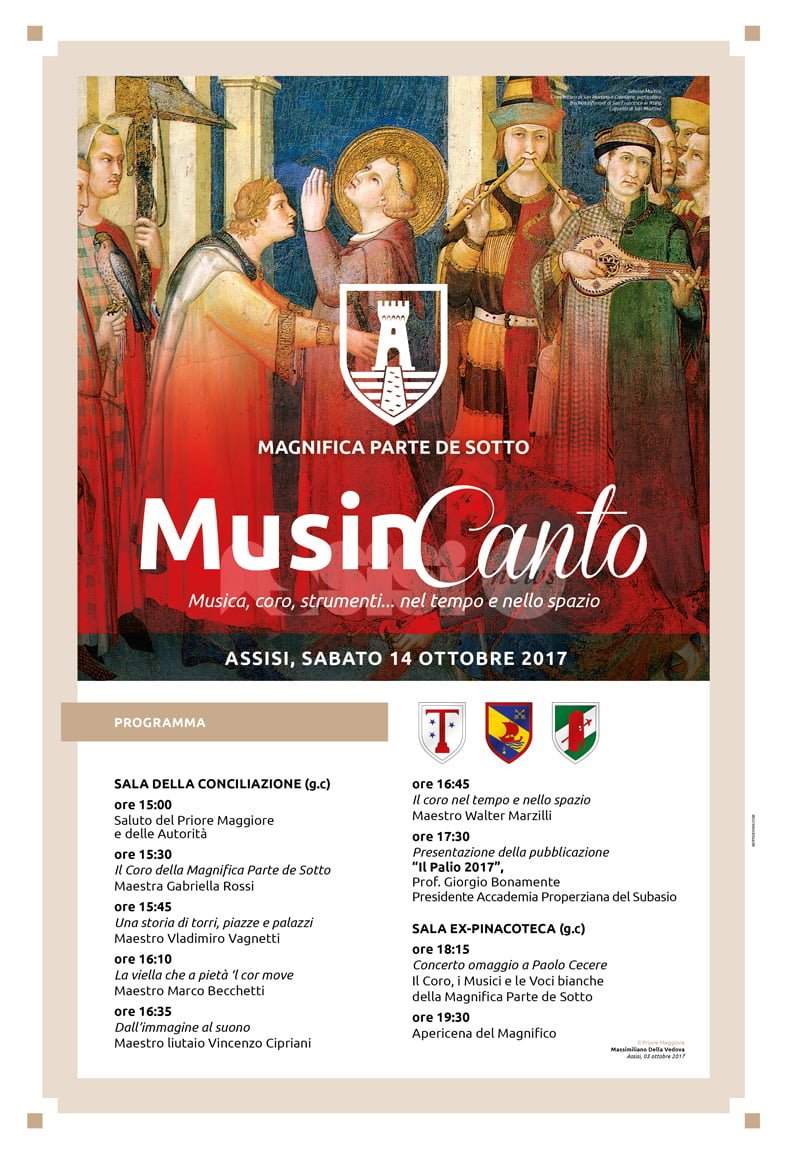 Questo il programma di sabato 14 ottobre, giorno di presentazione de Il Palio 2017: nella Sala della Conciliazione alle 15 il Saluto del Priore Maggiore e delle Autorità, alle 15.30 l’esibizione del Coro della Magnifica Parte de Sotto diretto dalla maestra Gabriella Rossi. Alle 15.45 “Una storia di torri, piazze e palazzi”, relatore il maestro VladimiroVagnetti, alle 16.10 “La viella che a pietà ‘l cor move”, relatore il maestro Marco Becchetti. Alle 16.35 “Dall’immagine al suono”, con il maestro liutaio Vincenzo Cipriani. Alle 16.45 “Il coro nel tempo e nello spazio”, con il maestro Walter Marzilli. Poi, come detto, alle 17.30 la presentazione ufficiale della Pubblicazione “Il Palio 2017″. A presentare il volume sarà il professor Giorgio Bonamente, Presidente dell’Accademia Properziana del Subasio. Al termine, nella Sala Ex-Pinacoteca alle 18.15, il Concerto del Coro, dei Musici e delle Voci Bianche della Magnifica Parte de Sotto in omaggio a Giuseppe Paolo Cecere; dalle 19.30 l'”Apericena del Magnifico” chiuderà la giornata.