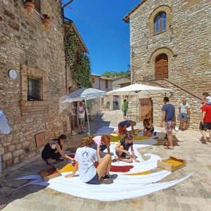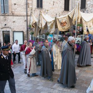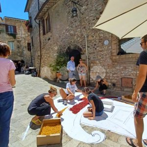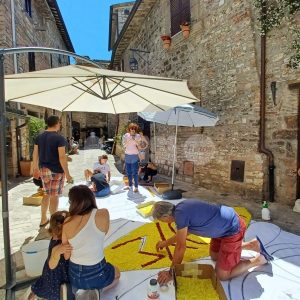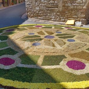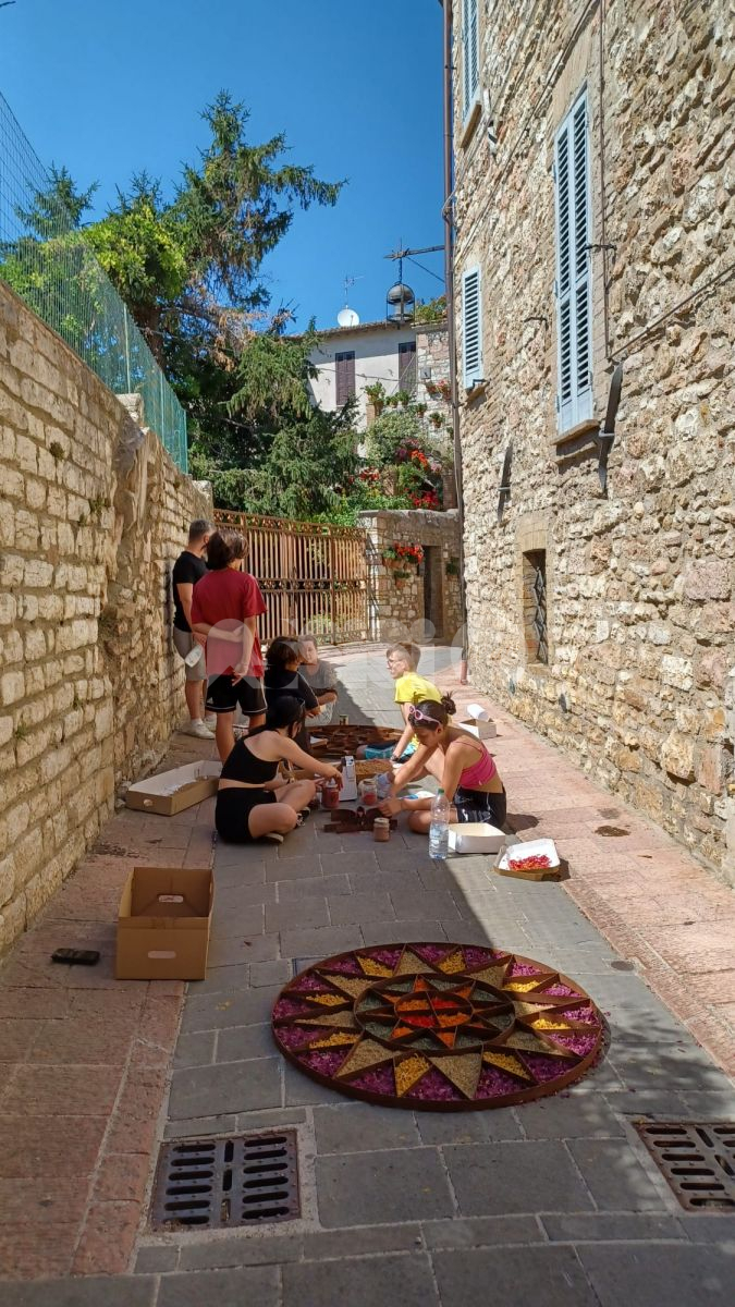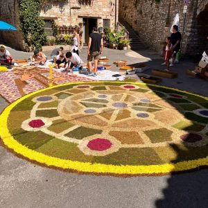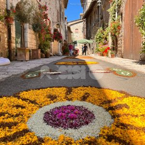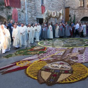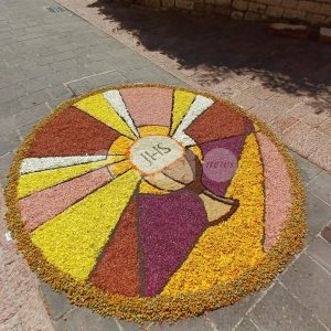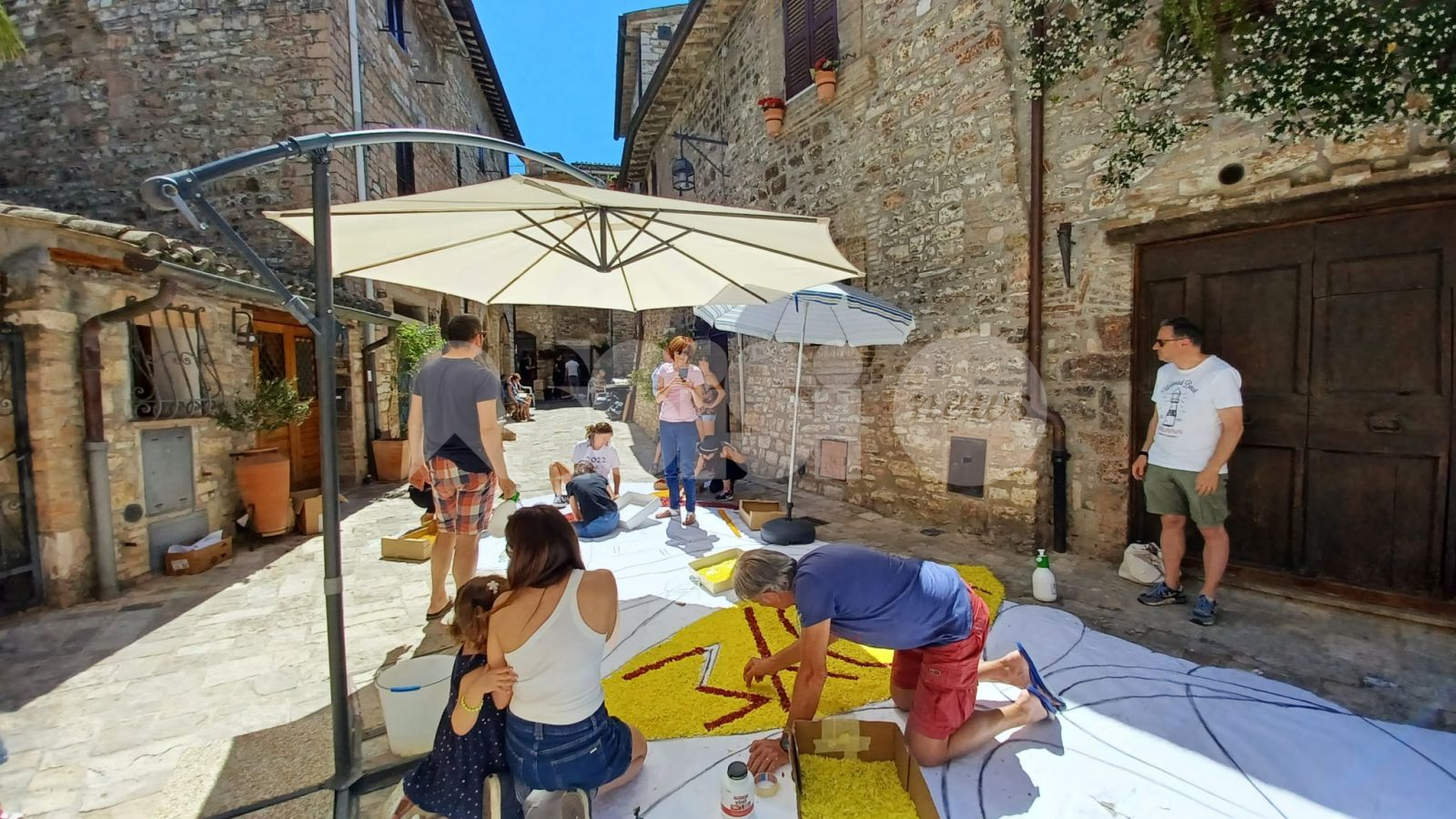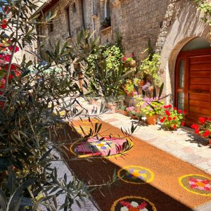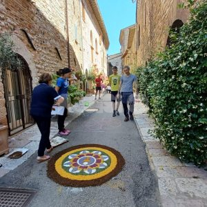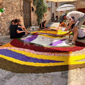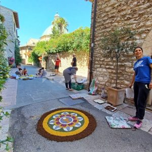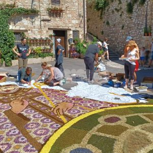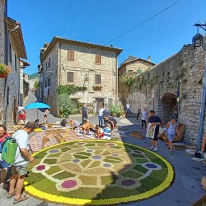 Non solo tappeti a Spello e Cannara. Anche nel centro storico e nelle frazioni della città serafica, per la solennità del Corpus Domini, si sono svolte le tradizionali Infiorate 2022 ad Assisi. Nel centro storico, le infiorate consistono nella creazione, sulle strade, lungo il percorso della processione delle Pulci, di un tappeto naturale costituito da petali di fiori, quadri e tappeti di fiori aventi come tema di base quello Eucaristico, religioso e decorativo.