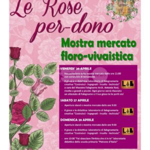 Il via ufficiale de Le Rose per Dono 2019 con l’inaugurazione venerdì 26 aprile: alle 11 il taglio del nastro della mostra mercato con una conviviale di benvenuto, a seguire ”Il gioco e la didattica”, laboratorio di falegnameria creativa “Costruisci – Ingegnati – Incolla – Inchioda” a cura del maestro falegname arch. Antonio Rosi, rivolto a grandi e piccini. Ogni giorno verrĂ rilasciato un attestato di falegname e ognuno potrĂ portare via con sĂ© il proprio gioco. Sabato 27 aprile alle 9 l’apertura degli stand e della mostra mercato. A seguire, ”Il gioco e la didattica”, laboratorio di falegnameria creativa “Costruisci – Ingegnati – Incolla – Inchioda”. La giornata conclusiva sarĂ quella di domenica 28 aprile: dalle 9 l’apertura della mostra mercato e degli stand. A seguire ”Il gioco e la didattica”, laboratorio di falegnameria creativa “Costruisci – Ingegnati – Incolla – Inchioda”. Poi alle 10, “Fai sbocciare l’artista che è in te”, laboratorio didattico della scuola primaria “Patrono d’Italia”.