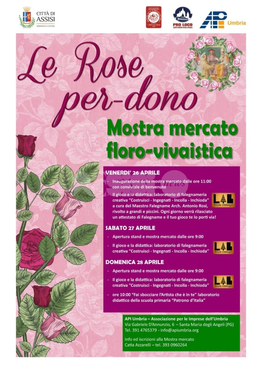 Torna Le Rose per Dono 2019, la terza edizione della mostra mercato ed esposizione floro-vivaistica che si terrà a Santa Maria degli Angeli dal 26 al 28 aprile, organizzata da Api Umbria in collaborazione con Catia Raffaella Azzarelli, con la partecipazione della Pro Loco di Santa Maria degli Angeli, dell’Associazione Priori del Piatto di Sant’Antonio Abate e con il patrocinio della Città di Assisi. La manifestazione, di grande successo nelle passate edizioni, vedrà alcune novità e un programma davvero ricco per una tre giorni attesa a Santa Maria degli Angeli.