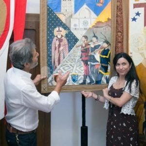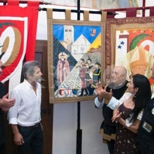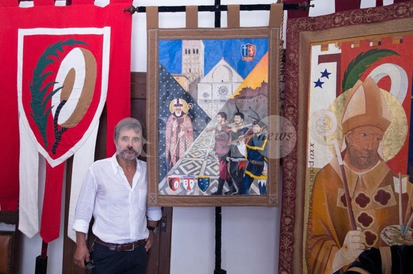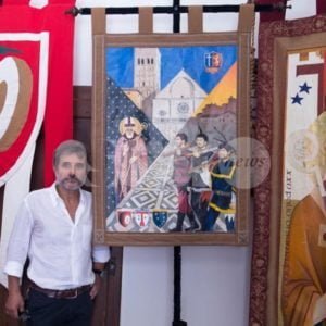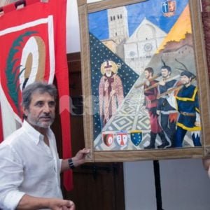 “Sono grato – ha dichiarato Lamberto Caponi, l’artista che ha dipinto il Palio di San Rufino 2018 – per essere stato chiamato ad onorare con il pennello i simboli del Palio di san Rufino oltre a quelli della festa del Cupolone di Santa Maria degli Angeli. Ho completato quest’anno con un trittico di Palii: sono stato vincitore del Concorso per il Palio del San Michele di Bastia e per quello del Cupolone. Quello di san Rufino è contrassegnato da simboli ispirati al medioevo, a cui si fa risalire l’origine della balestra che coincide con il passaggio dal genere pittorico greco/bizantino per arrivare a Giotto con i primi esperimenti di prospettiva non ancora perfezionata. Al centro del Palio 2018 non poteva mancare la facciata della cattedrale di san Rufino e, ai lati, i balestrieri dei tre terzieri, in atteggiamento di fiera appartenenza, con l’immagine del santo protettore di Assisi”.