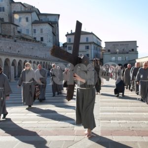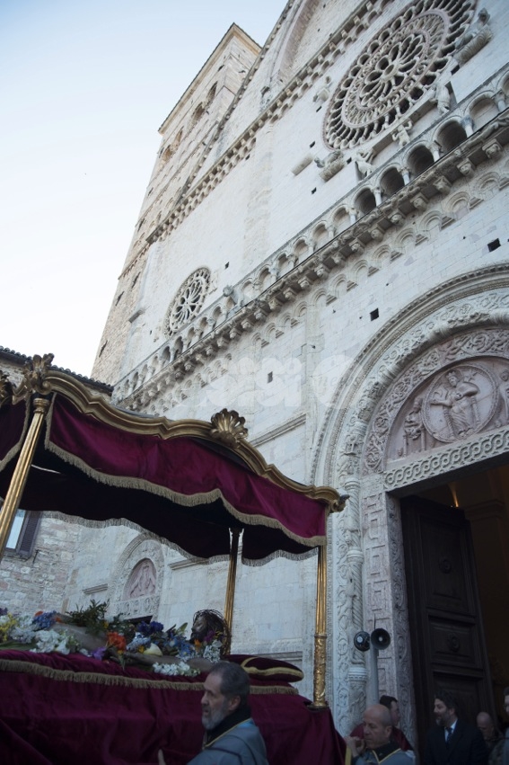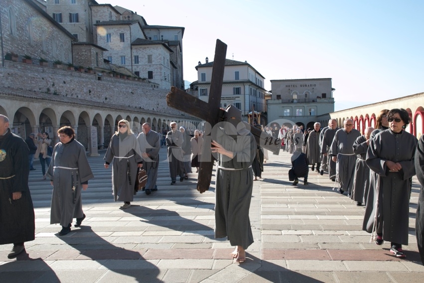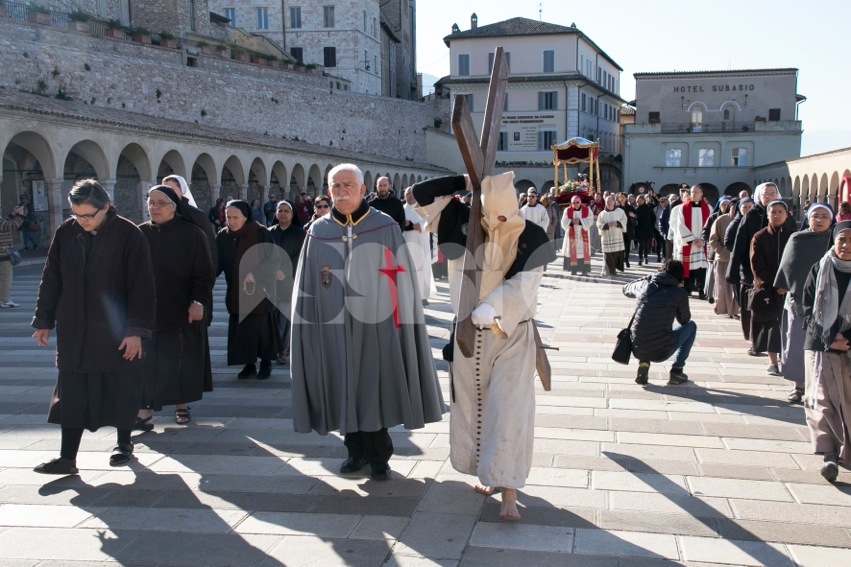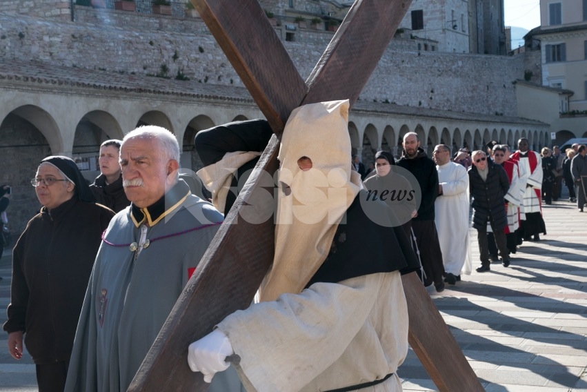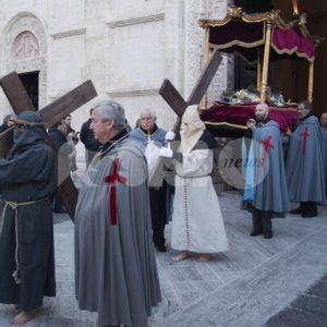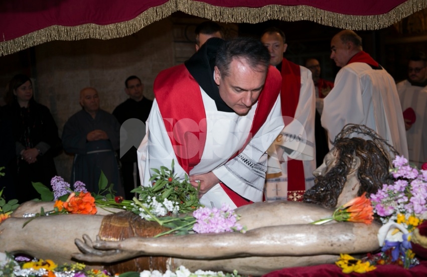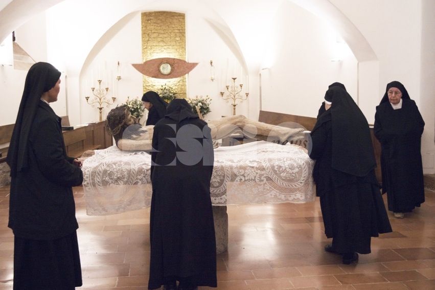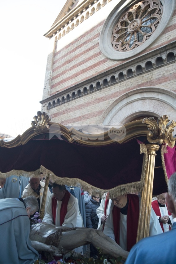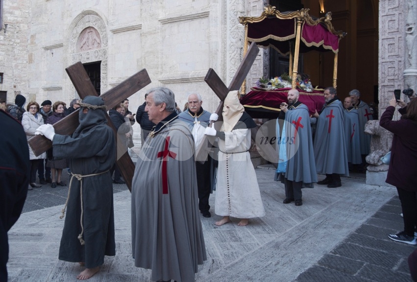 Il venerdì Santo, alle ore 6,45, dopo la celebrazione dell’ufficio delle Letture, il Cristo Morto è trasferito dalla Cattedrale di San Rufino alla Basilica Papale di San Francesco con un percorso che passa per i principali conventi e monasteri cittadini. Nel pomeriggio nella chiesa di S. Maria Maggiore si celebrano “Tre Ore di Agonia”.