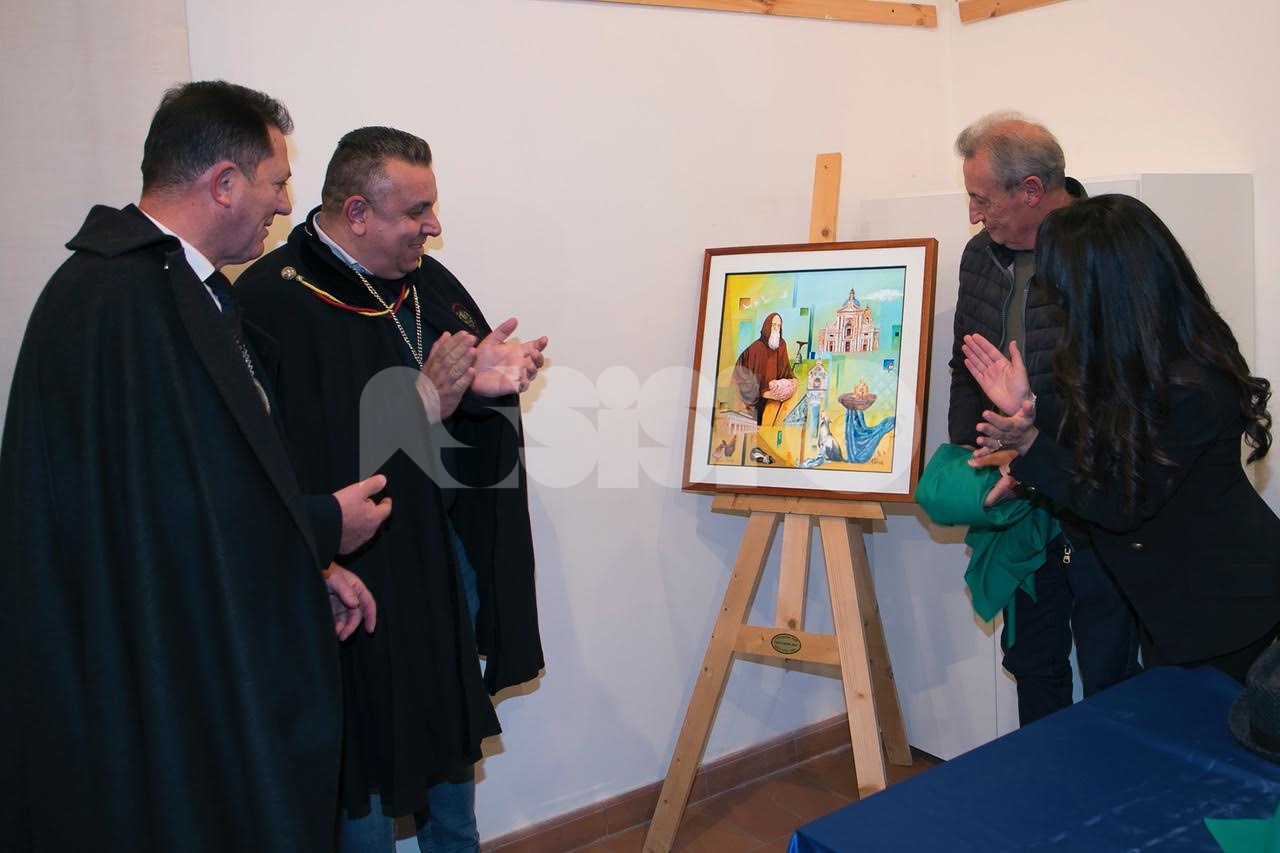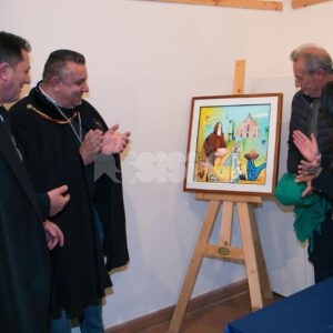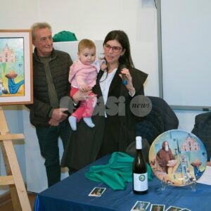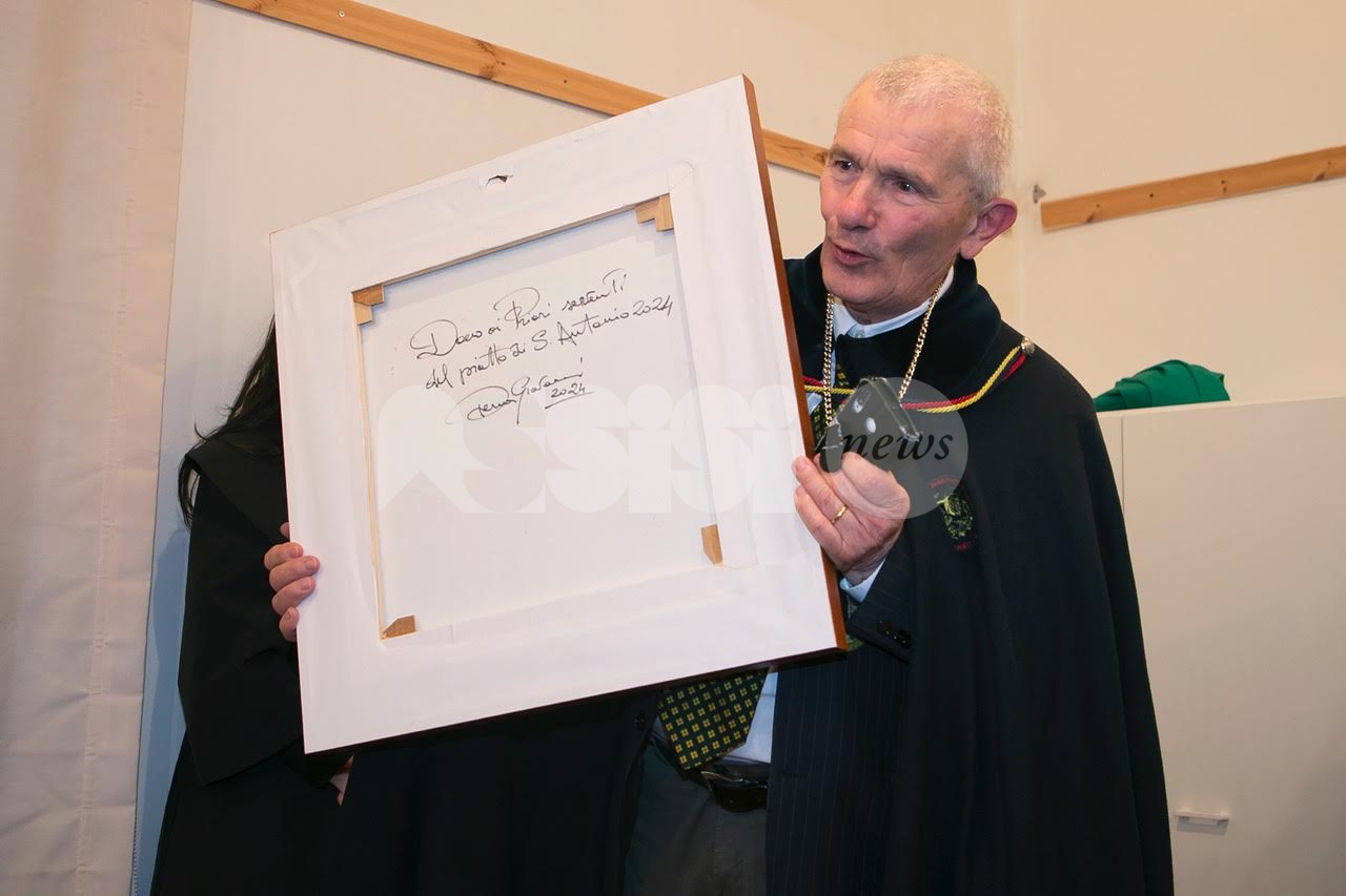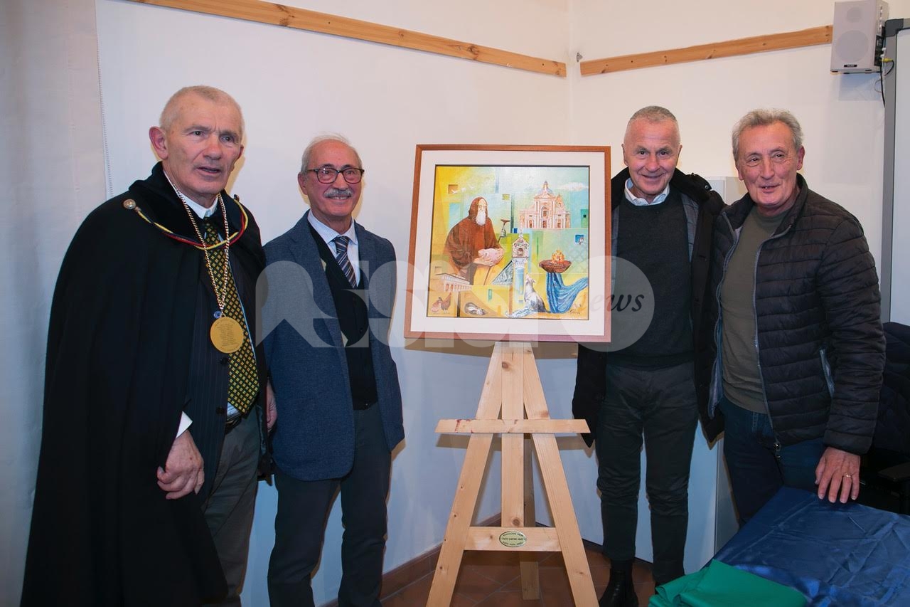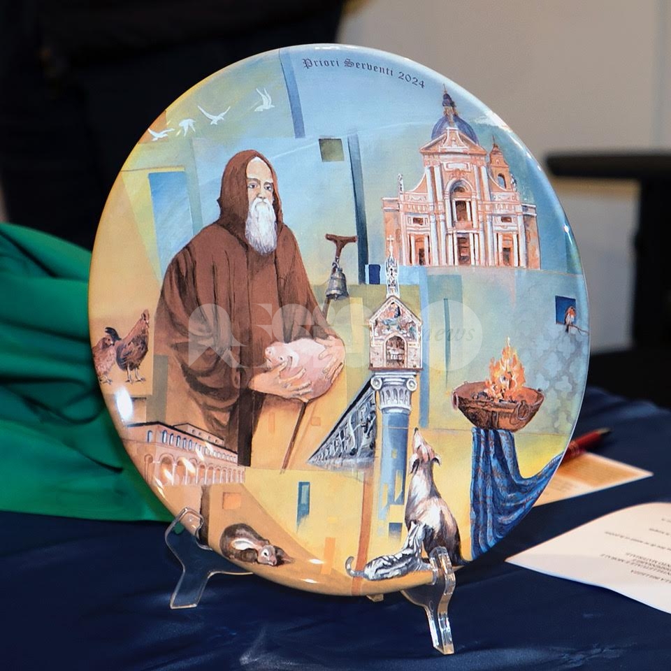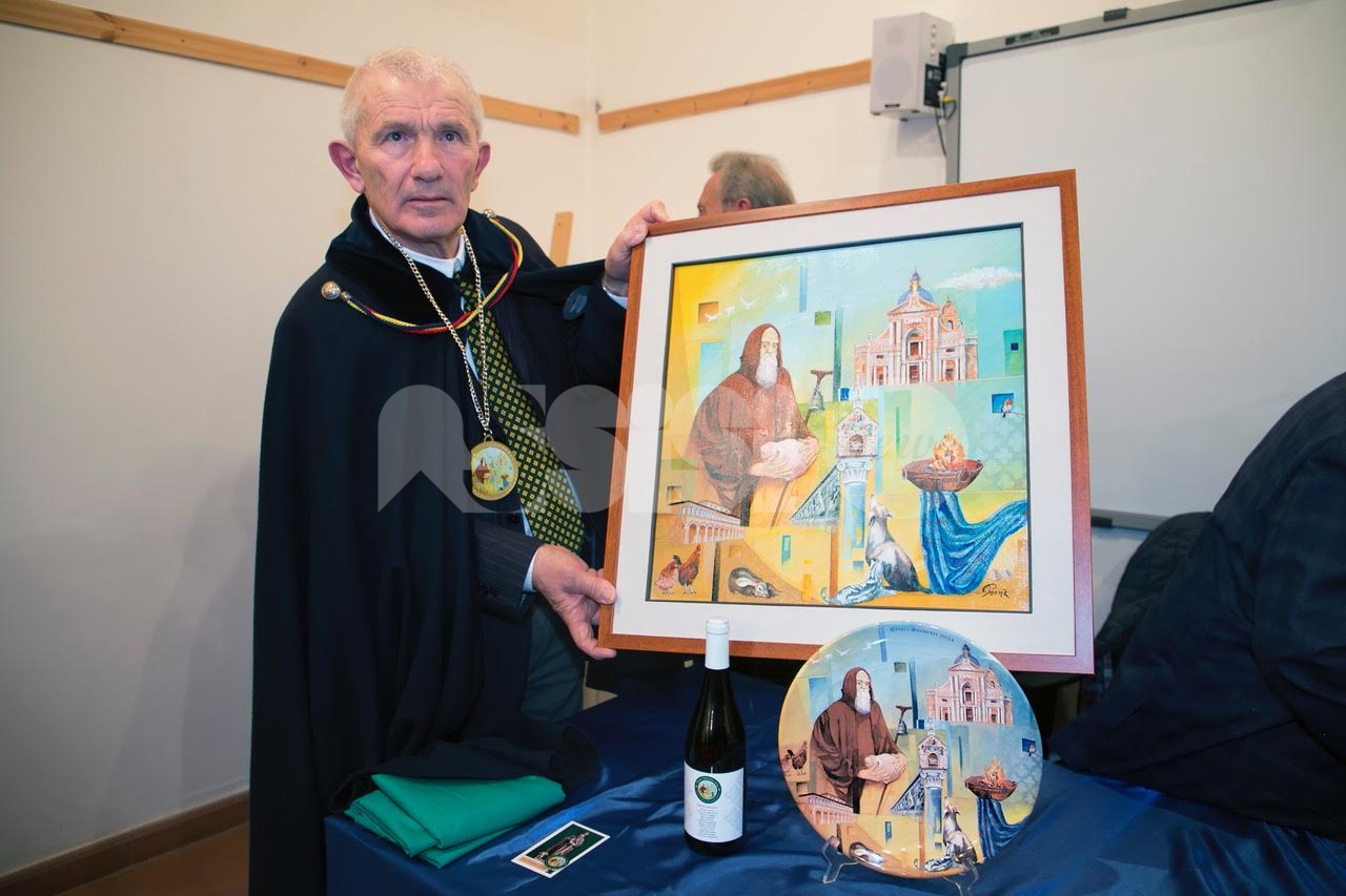 Nel corso del pomeriggio è stata svelata anche l’opera dell’artista Giovanni Perna, scelta come immagine rappresentativa della Prioranza 2024. Giovanni Perna, classe 1952, artista poliedrico, è nato ad Ercolano (Napoli) nel 1951 ma dal 1973 risiede in Umbria, dove ha frequentato negli anni ‘90, gli studi dei pittori Miguel Lombroni e del Maestro Raffaele Tarpani. Ha partecipato a numerose estemporanee vincenti premi e segnalazioni dalle giurie e oltre a partecipare a collettive ha anche organizzato esposizioni di sue personali, riscuotendo apprezzamenti di pubblico e critica. Presentate inoltre la bottiglia del vino del Piatto di Sant’Antonio 2024 e l’etichetta, e il piatto in ceramica.