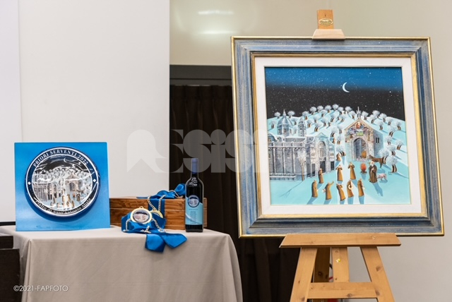 Oltre alla presentazione del programma del Piatto di Sant’Antonio Abate 2022, i Priori Serventi hanno presentato anche l’opera realizzata da Vincenzo Martini e il coordinato istituzionale della Festa del Piatto di Sant’Antonio 2022: logo, etichetta vino, piatto in ceramica e medaglia. La bellezza dell’arte e la fede sono state esemplarmente sintetizzate dal professor Giovanni Zavarella che ha fatto seguito allo svelamento del dipinto del maestro Martini. “C’è tanta grazia e felicità nella sua opera- ha dichiarato il professor Zavarella – avendo saputo, dall’alto della sua sapienza pittorica, figurare, con tanta poesia, non solo gli elementi architettonici della Basilica ottocentesca, della Porziuncola medievale, con le atmosfere di Santa Maria nel paesaggio assisiate”.