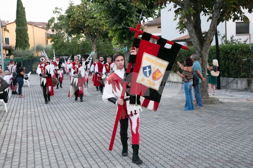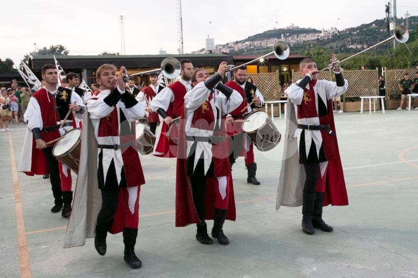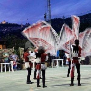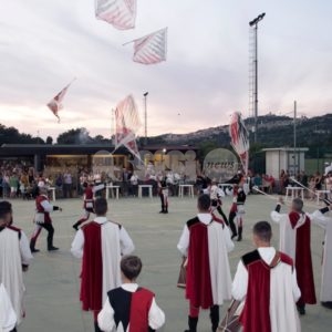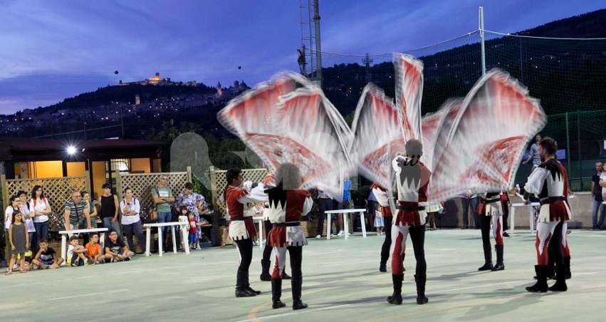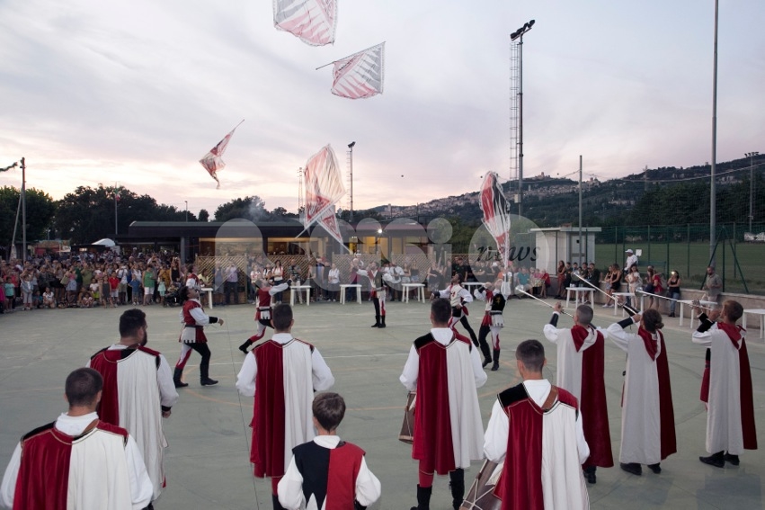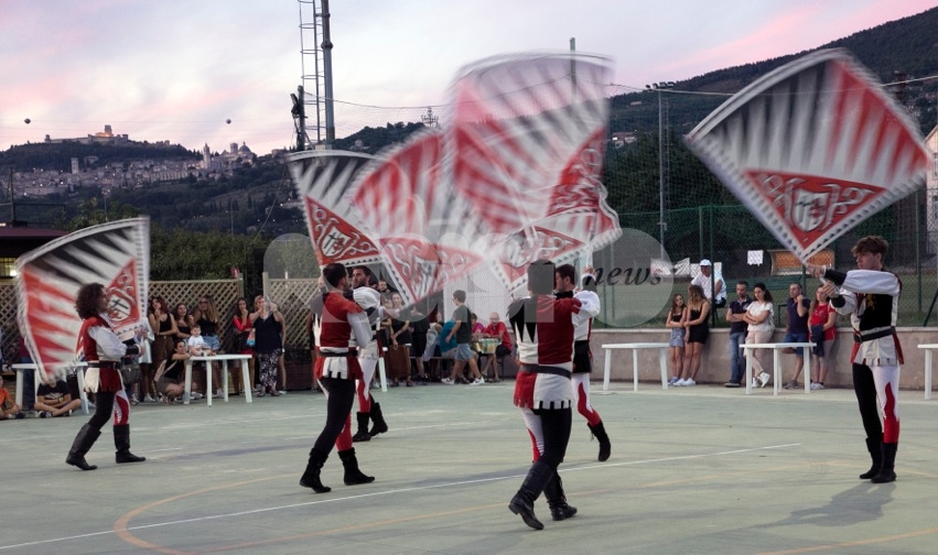 Il saluto francescano di pace e bene che gli Sbandieratori di Assisi portano da oltre 40 anni in giro per il mondo è arrivato ieri sera a Rivotorto di Assisi per aprire la prima serata della Rassegna degli Antichi Sapori 2019. La determinazione, la precisione, l’abilità nel manovrare il drappo, la destrezza, il colpo d’occhio e l’accurata preparazione atletica – aiutati anche da un tramonto mozzafiato – hanno riscosso ancora una volta l’interesse del pubblico, che ha applaudito numeroso lo spettacolo dei “messaggeri di Pace” assisani, un momento di omaggio che il direttivo della Pro loco ha voluto portare a Rivotorto per celebrare gli Sbandieratori di Assisi e il Calendimaggio di Assisi, principale festa laica cittadina alla quale partecipano anche molti giovani rivotortesi.