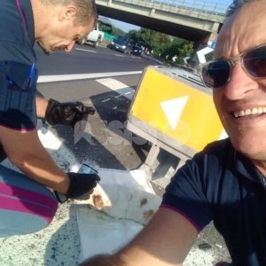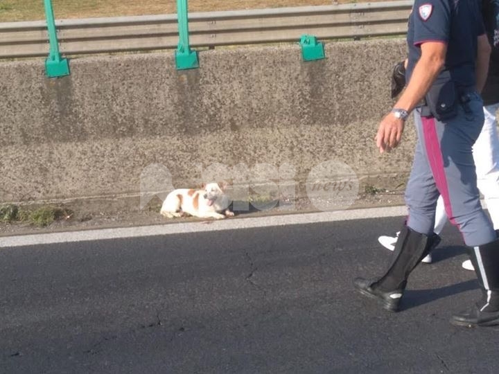 “La pattuglia della Polizia Stradale – si legge in una nota diffusa anche via Facebook – della Sezione di Perugia, ha soccorso un amico a 4 zampe localizzato a ridosso del new jersey lungo la E45, indebolito ed immobile dalla paura. Beh! Non è un bel tratto di strada, il traffico è intenso non solo per il flusso dovuto alle uscite domenicali di fine agosto, ma anche per la presenza di uno scambio di carreggiata causa lavori in corso”.
