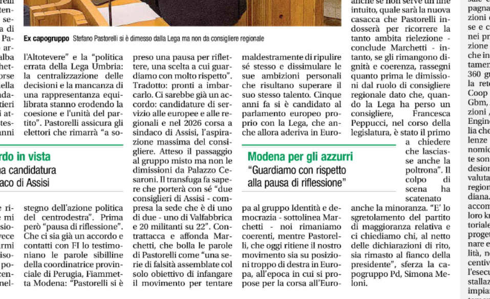 Non si fermano i botta e risposta dopo l’addio di Stefano Pastorelli, che porta con sé 21 militanti su 23 della Lega comprensoriale, tra cui il segretario Simone Pasqualoni e i consiglieri Jacopo Pastorelli e Francesco Mignani. Intanto non si fermano i rumors sul futuro dell’ex capogruppo: secondo il Corriere dell’Umbria in edicola domenica mattina, ci sarebbe un accordo con Forza Italia, per una candidatura di servizio alle Europee 2024 che lancerebbe quella per le Regionali (come già avvenuto cinque anni fa con la Lega) per poi tentare la corsa alla vera poltrona che sta a cuore a Pastorelli, quella a sindaco di Assisi.