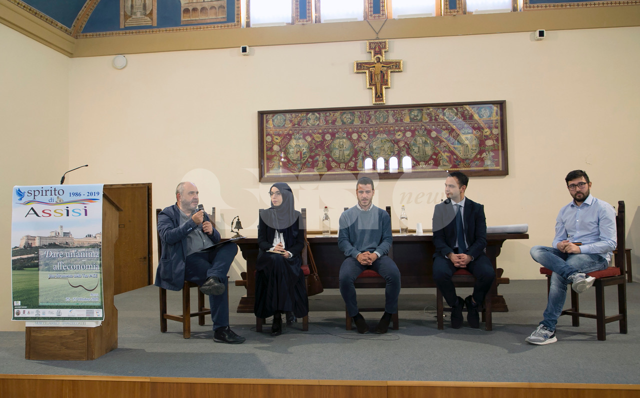 Dopo i saluti del preside dell’Istituto teologico, padre Giulio Michelini, la professoressa Annarita Caponera ha tenuto una relazione sul legame tra religione ed economia concludendo che, questi due ambiti, “si legano insieme perché c’è l’uomo che ne è il produttore e il beneficiario. Un’economia che non abbia un riferimento all’uomo e al suo modo di organizzare la vita, e la sua vita in comunità, non esiste. Il problema è quindi: quali sono le regole che devono essere osservate per garantire la produttività dei processi economici? La sfida è consentire alle religioni di tornare a disciplinare eticamente, moralmente, il mercato economico”. Nel merito dell’argomento sono poi entrati i relatori di Quale economia a partire dalle fedi, moderata dal presidente della commissione Spirito di Assisi, don Tonio Dell’Olio che ha colloquiato con la musulmana Yasmin Doghri, Alessandro Busti (Baha’ì), Alessio Lanfaloni per i cattolici e Graziano Di Nepi, dell’Unione Giovani ebrei d’Italia (UGEI).