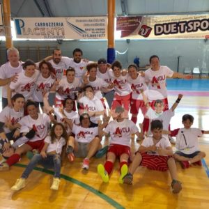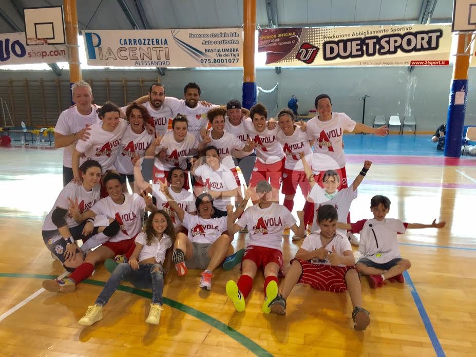 IL TRAGUARDO: Tutte le ragazze e lo staff con la maglia personalizzata che recita lo slogan “fAvola Elite”. Canta il PalaItis. Urlano, ballano e sorridono i tantissimi tifosi e i tanti appassionati accorsi da tutte le parti dell’Umbria. Trionfa l’Angelana. E adesso il sogno è realtà: sarà “un’Angelana d’Elite”.
