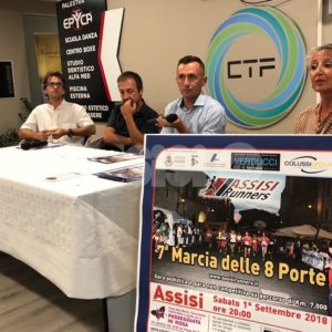 Il programma della Marcia delle 8 porte 2018 è stato presentato presso il CTF Wellness di Santa Maria degli Angeli dal presidente di Assisi Runners, Fabio Battistelli, insieme ad alcuni runners dell’associazione e alle rappresentanti dell’associazione Punto Rosa (tra cui la presidente Silvana Pacchiarotti), martedì 28 agosto. “Presentiamo la settima edizione di una manifestazione in grande crescita. Una corsa che ha molto seguito, piace moltissimo agli assisani e ai turisti. Ciò ci da la forza e lo stimolo per andare avanti e farla crescere sempre di più”, ha detto Battistelli, anticipando che ci sono già circa 150 atleti iscritti alla podistica, ma l’obiettivo è di arrivare alle 250 presenze. “Il nostro obiettivo – ha aggiunto Evian Morani, uno dei tesserati dell’Assisi Runners – è di portare colore e vita ad Assisi, all’interno delle mura. Nonostante le difficoltà logistiche questa è una manifestazione importante. Assisi è un luogo unico al mondo, ben vengano queste manifestazioni”.